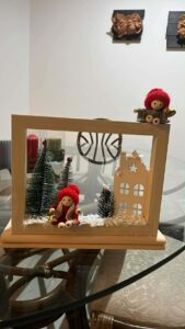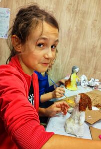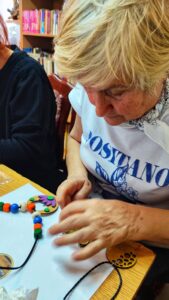 - Spotkanie 5 : Rękodzieło użytkowe świąteczne – dodatkowe warsztaty dla dwóch grup po 15 osób ( 10 seniorów + 5 dzieci młodzież 6-19 lat) Zrealizowane 4 spotkania (10 godzin). • Udział 30 osób (20 seniorów + 10 młodzieży). • Powstałe prace: biżuteria, elementy rękodzieła, spódnice sceniczne.