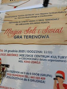 “Magia Soli i Świąt” to fotograficzna opowieść o radości odkrywania i wspólnym świętowaniu w sercu Ciechocinka. Zdjęcia ukazują emocje uczestników gry terenowej – organizowanej w ramach projektu finansowanego z Budżetu miasta Ciechocinka przez Stowarzyszenie Nasza Ostoja kierowanej do dzieci, młodzieży, rodziców i seniorów – którzy w świątecznej atmosferze podjęli wyzwania i razem tworzyli wyjątkową historię Solnego Miasta. Dziękujemy wszystkim, którzy aktywnie włączyli się w przygotowania i pomoc w organizacji tego przedsięwzięcia. Szczególne podziękowania kieruję do Miejskiego Centrum Kultury w Ciechocinku , która czynnie włączyła się w działania; Miejskiej Radzie Seniorów w Ciechocinku , Prezes Stowarzyszenia Iwonie Roch i członkom Stowarzyszenia Nasza Ostoja ; Dz. Promocji Miasta Ciechocinka ; oraz Kacprowi Wieczorkowskiemu i Sandrze Kołodziejskiej , którzy zadbali o oprawę fotograficzną wydarzenia. Szczególnie wszystkim uczestnikom zabawy, którym inwencji i chęci do dobrej zabawy nie zabrakło. I ty małym i trochę starszym.