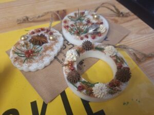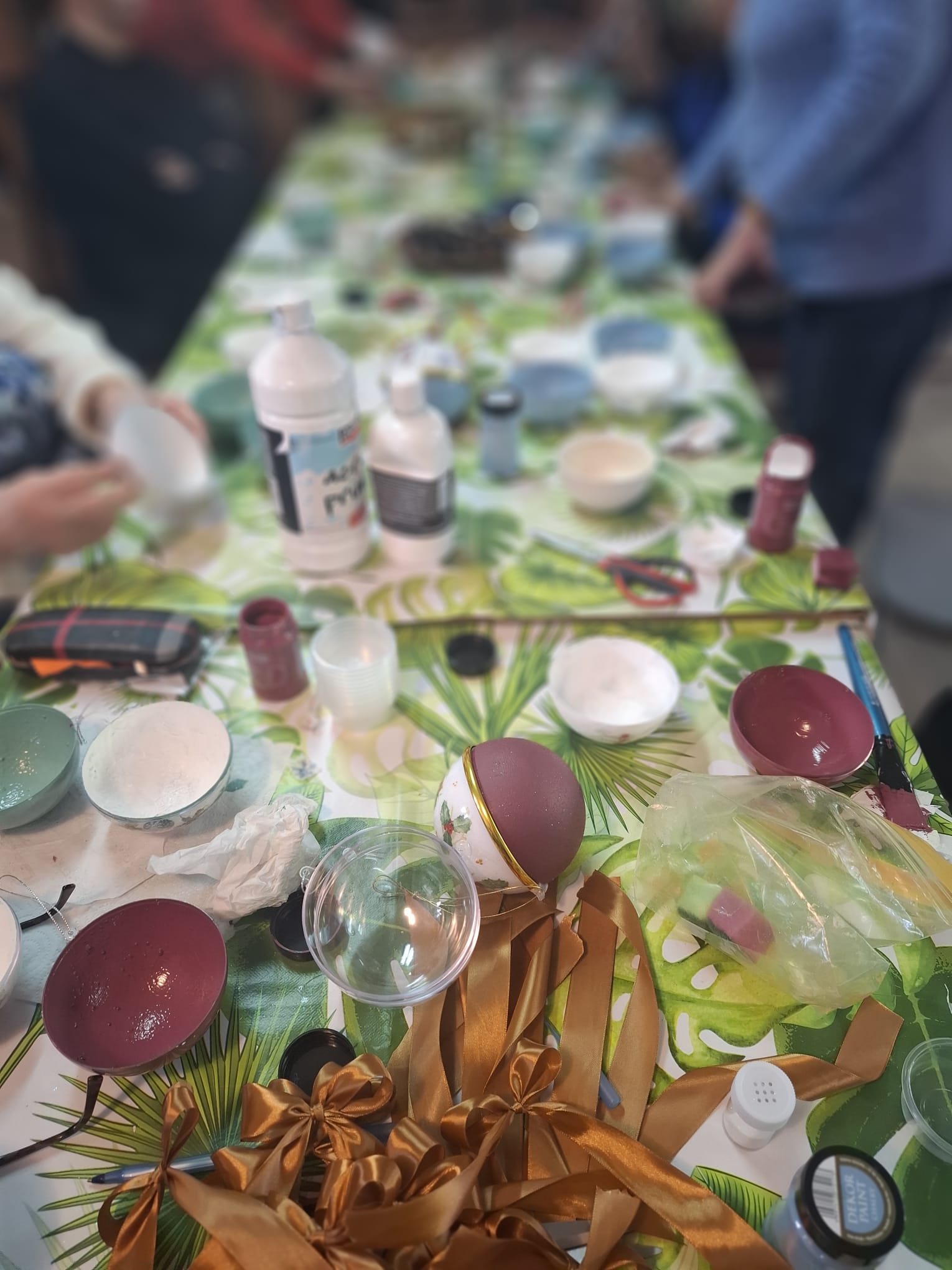 Super atmosfera w grupie dużo radości a nawet rywalizacja czyja bombka ładniejsza. Wszystkie są piękne, wystarczy popatrzeć na zdjęcia. Praca wre, krótka przerwa o 14:00 na obiad przygotowany przez Spiżarnie Kujawską i powrót do pracy.