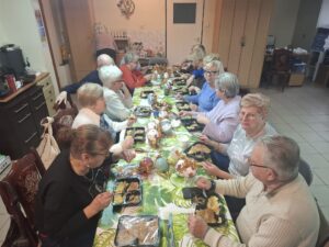 19 grudnia to najważniejszy dzień w życiu Klubu, bo to Wigilia Sąsiedzka, która została zorganizowana w Restauracji Bristol. Uczestnicy klubów Otwarte Drzwi i Nasza Ostoja mieszkają na tym samym osiedlu czyli są sąsiadami i tak wymyślili, że zaproszą się wzajemnie na Wigilie. Jeszcze 19 grudnia zaszczycili nas swoją obecnością Pan Jarosław Jucewicz Burmistrz Ciechocinka i Pani Joanna Dyrżałowska Wiceburmistrz Ciechocinka, przybyli do nas z życzeniami świątecznymi. Życzenia złożyła też i podzieliła się opłatkiem Pani Domicela Kopaczewska wiceprezes Uzdrowiska S.A. Naszą uroczystość uświetniła młoda artystka Julia Czerny. Uczestniczka i laureatka III edycji konkursu „Odkrywamy talenty potężnie Człowiek zwyczajny – niezwykły”. Pięknie zatańczyła „Pasadoble”. Zabawiały nas gwiazdy ze „Złotej Maski” Ania Przekwas, Małgosia Naguszewska i Stasia Buczkowska. A Agata Krzyżanowska zaprezentowała wystawę fotograficzną „Zielony Kadr i miejski ruch”. Restauracja przygotowała dla nas wigilijne menu: zupa grzybowa, czerwony barszcz, kilka rodzajów pierogów, kapusta z grzybami i pieczony karp, sałatka jarzynowa i ryba po grecku. Na deser był sernik, makowiec, keks, piernik i kawa. Wszystko pyszne i gorące. Po jedzeniu śpiewaliśmy kolędy i było bardzo podniośle i uroczyście.